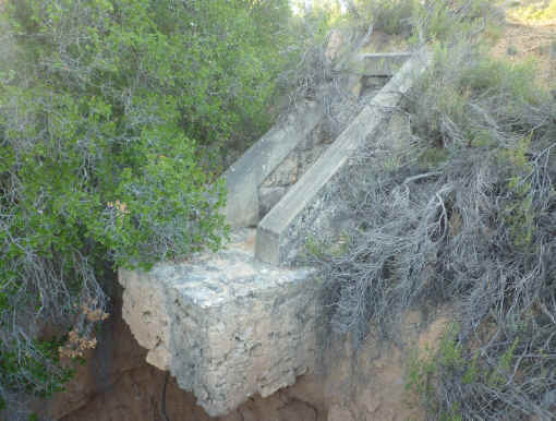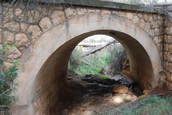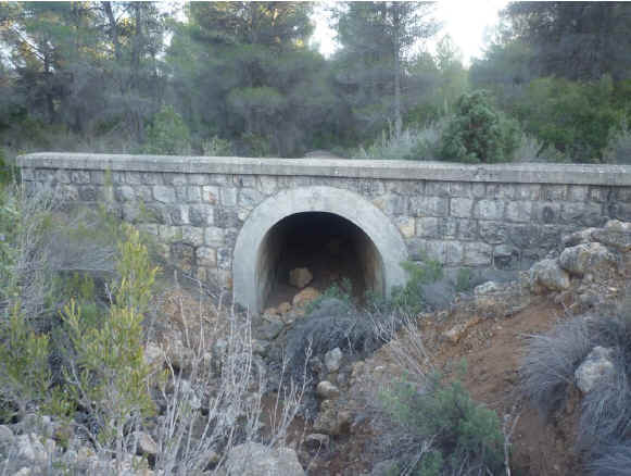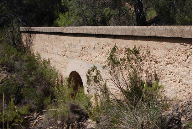 78. Alcantarilla. Alcantarilla del Barranco Lombardo (Latitud 39º29’59.28”N; longitud 1º16’59.27”O). Boca de un metro. Poca largura. Barranco poco profundo. Ojo con sillería fingida de hormigón armado y paramento de mampostería concertada de aparejo poligonal.
