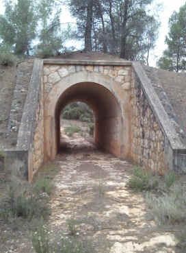 117. Puente de alcantarilla. Puente de alcantarilla en la Loma del Carril (Latitud 39º29’55.16”N; longitud 1º17’21.57”O). Puente de un solo ojo de medio punto todo de hormigón y con sillería fingida. Con estribos laterales adaptados al terraplén. Altura aprox. de 5 m. para la circulación de agua. En medio de terraplén.