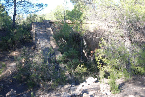 51. Alcantarilla. Pequeña alcantarilla en la vía explanada del Peñón (latitud 39°26'3.23"N; longitud 1°25'19.02"O). A pesar de su pequeña magnitud presenta ojo de hormigón armado con paramento de mampostería de aparejo poligonal que se repite en su interior hasta media altura.