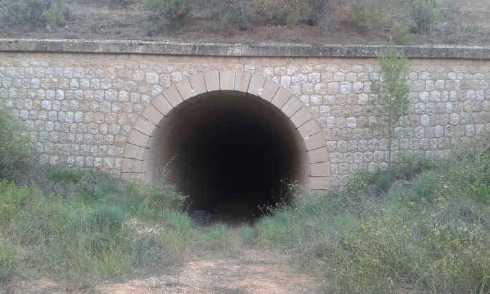 15. Túnel. Túnel 16 anterior al barranco del Moro (latitud 39°25'26.30"N; longitud 1°29'0.53"O). Estado perfecto. 302 metros de longitud. Asfaltado. Circulable. En curva. Desaguaderos en los márgenes en perfecto estado. Bien cuidado. De hormigón armado que en boquera y paramento posee llagueado que imita sillería y dovelaje.