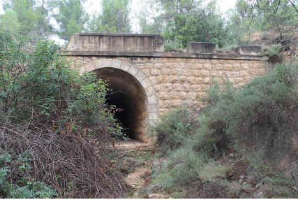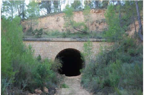 36. Alcantarilla. Alcantarilla de paso de agua que en su boca oeste está rodeada de hormas de piedra, excepto por uno de los lados, para encauzar el agua (latitud 39°25'37.41"N; longitud 1°26'53.46"O). Encima de la alcantarilla hay un elevado terraplén para circulación del tren. Arco de medio punto de hormigón armado con paramento de mampostería de aparejo poligonal que se repite en el interior hasta media altura.