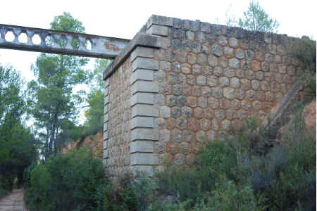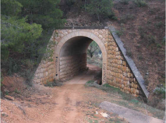18. Alcantarilla. Alcantarilla tras el Viaducto del Barranco del Moro (latitud 39°25'24.78"N; longitud 1°28'42.86"O). Unos dos metros de luz. En paramento e interior hasta media altura mampostería concertada de aparejo poligonal. Boquera de hormigón armado con llagueado imitando dovelaje.