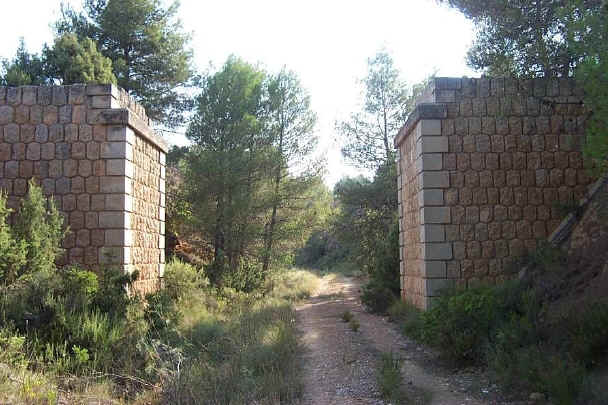105. Viaducto. Viaducto de la Albosa (o del Rebollo o de Cañá Grande) (latitud 39º28’15.47”N; longitud 1º20’52.46”O). Incompleto. Impracticable. Estaba proyectado dos arcos a cada lado de 12 metros de luz y en medio un gran arco con 30 metros de luz que salvaba todo el cauce de la rambla. Sólo se realizaron los dos arcos del margen derecho de la rambla. Están preparados para doble vía. Arcos de hormigón armado de medio punto. Enjutas con mampostería concertada de aparejo poligonal. Pilares intermedios que soportan la estructura son de hormigón armado con sillería fingida que se resalta en las esquinas. Buen estado. Utilizado para deportes de aventura. Existe plano en el AGA.