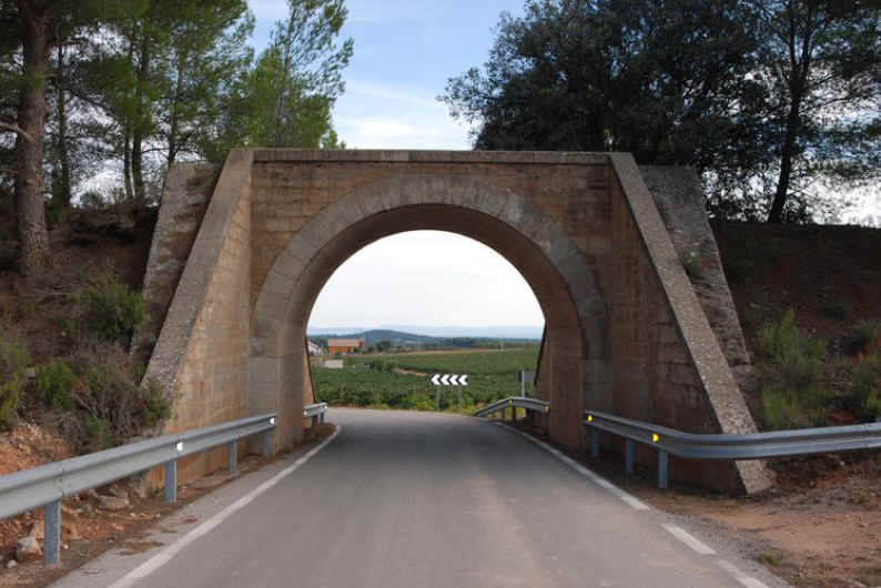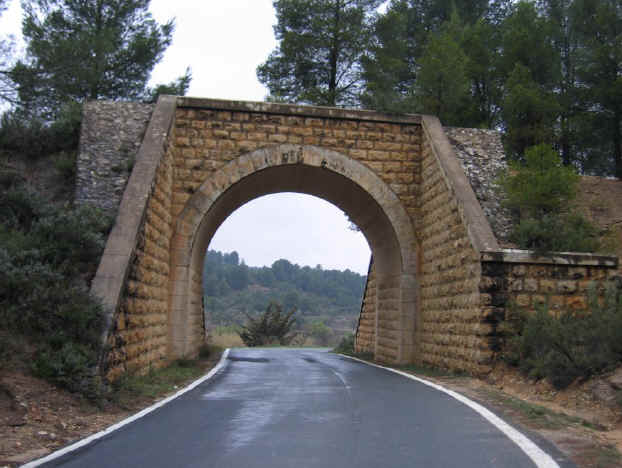 42. Puente de camino. Puente de camino de Hoya Quemada (muy cercano a Túnel 21) (latitud 39º26’11.21”N; longitud 1º25’52.95”O). Luz ojo 3,5 ca., anchura total de 9,5 m.; altura 4 m. ca.; profundidad total 24 m. Arco de medio punto de hormigón armado con paramento de mampostería de aparejo poligonal de cara vista con labra basta que se repite en el interior hasta media altura. Estribos laterales adaptados al talud del terreno. Circulable.